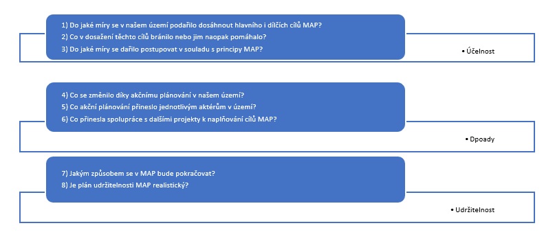 - Stanovení cílů evaluace a evaluačních otázek - evaluátor společně s RT MAP a ŘV MAP stanoví témata a cíle evaluace a v návaznosti na ně evaluační otázky, pokud budou nad rámec povinných témat a otázek týkajících se účelnosti, dopadů a udržitelnosti.